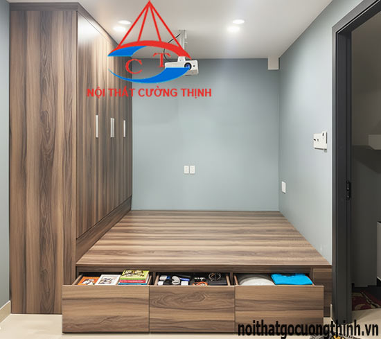 Giường phản dạng bục cao có hệ ngăn kéo tích hợp tủ quần áo tiện ích cho những phòng ngủ nhỏ, tối ưu diện tích, tạo vẻ đẹp tinh tế và hiện đại.